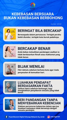 15 Julai 2022 | Aktiviti TerkiniKempen Kebebasan Bersuara Bukan Kebebasan Berbohong masih lagi giat dijalankan. Kempen ini bertujuan untuk mendidik masyarakat supaya berhati-hati dalam menggunakan hak kebebasan bersuara. Terdapat lima garis panduan dalam menggunakan hak kebebasan bersuara. Yang pertama adalah beringat bila bercakap. Kita perlu berwaspada dalam pertuturan. Bak kata pepatah,” Terlajak perahu boleh diundur, terlajak kata buruk padahnya”. Yang kedua, bercakap benar. Kita bebas meluahkan pandangan asalkan ia tidak berdasarkan fitnah atau maklumat yang tidak benar.