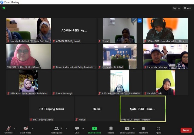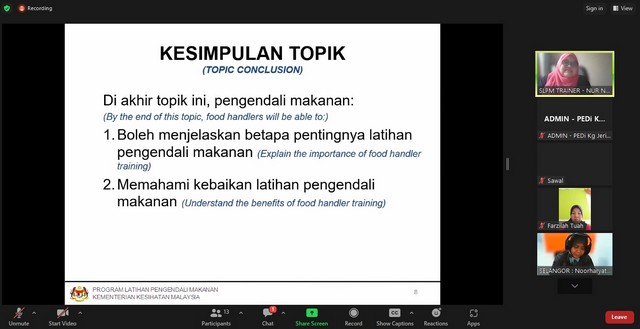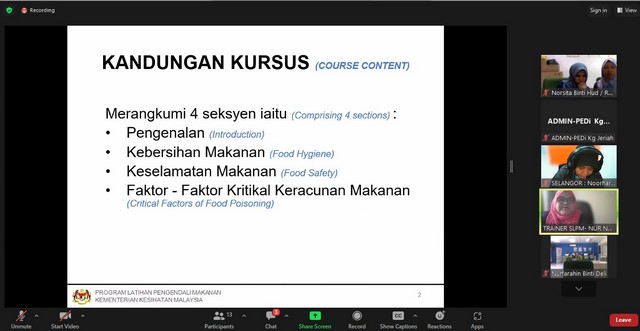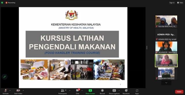 10 Disember 2023 | Aktiviti TerkiniPada 9 Disember 2023 (Sabtu), PEDi Kg. Jeriah dengan kerjasama NZ Bunga Venture telah melaksanakan Kursus Latihan Pengendali Makanan Siri 19 pada pukul 09:30 pagi sehingga pukul 12:30 tengah hari. Kursus tersebut telah dijalankan secara atas talian melalui aplikasi Zoom. Kursus tersebut telah dihadiri oleh 2 orang peserta di mana kedua-dua perserta tersebut telah menyertai kursus ini dari rumah.