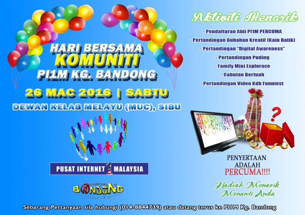 Orang ramai di jemput datang bagi memeriahkan Majlis Hari Bersama Komuniti Pusat Internet Kg Bandong yang bertempat di Dewan Kelab Melayu (MUC), Sibu pada 26 Mac 2016 (Sabtu) ini. Terdapat banyak aktiviti menarik yang bakal di anjurkan oleh pihak Pusat Internet Kg. Bandong dan hadiah menarik menanti anda.